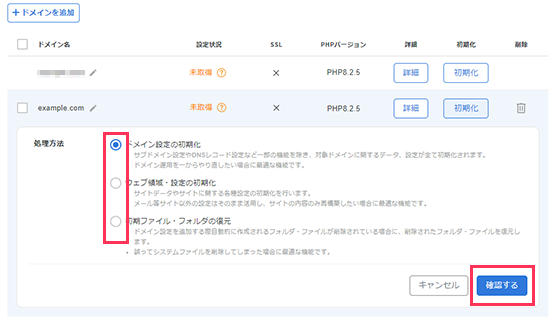 本機能は、サーバーパネルに追加済みのドメイン設定に対して、アップロード済みデータや設定を初期化する機能です。