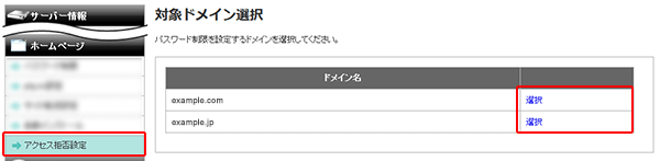 管理パネルへログイン後、[ 無料レンタルサーバー ]メニューより、サーバー管理パネルへログインしてください。 サーバー管理パネルのメニューより「アクセス拒否設定」をクリックし、対象ドメインを選択してください。